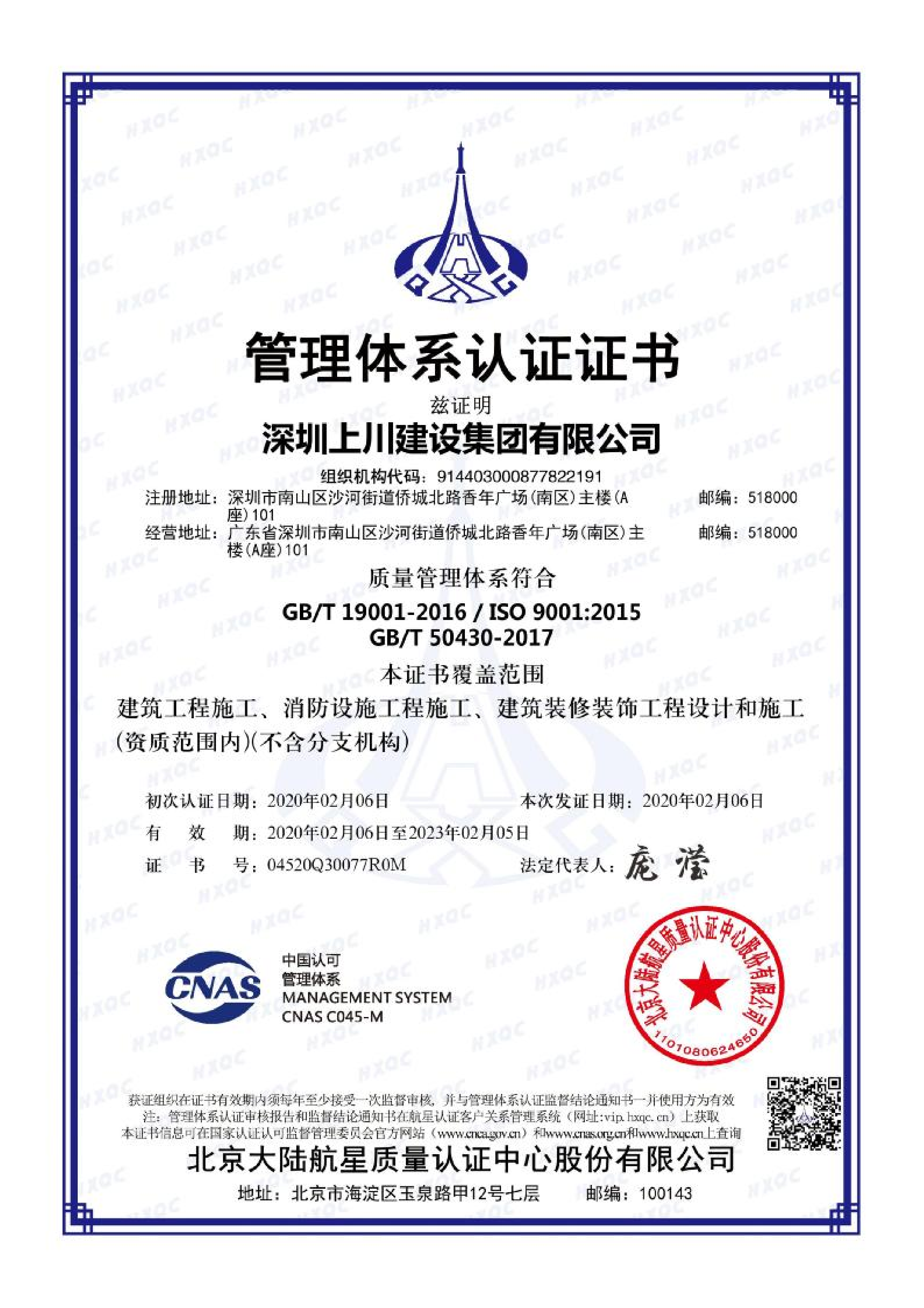 上川建設-質量管理體系認證證書
