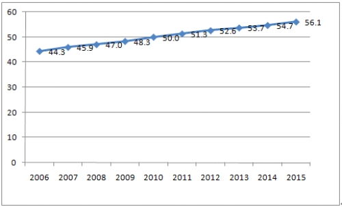 我國的城鎮化率在不斷提高,“十二五”期間,我國城鎮化進程穩步推進,城鎮化率顯著提升,年均提高1.23個百分點,每年城鎮人口增加2000萬,到2015年,我國的城鎮化率已經提高至56.1%,城鎮常住人口為7.71億。盡管如此,我國城鎮化率還是遠低于發達國家80%的平均水平,也低于人均收入與我國相近的發展中國家60%的平均水平,還有較大的發展空間。
