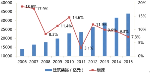 從歷年建筑裝飾產值與全國GDP比重上看,該比重基本在5%上下浮動,近幾年呈小幅上升變動。自2006年至2015年,全國建筑裝飾行業工程總產值由1.4萬億增長至3.4萬億元,年均復合增長率為10.36%。盡管自2012年開始,行業工程總產值同比增長率逐漸下滑,但總體仍保持著穩健的發展態勢。