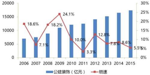 2006年至2015年全社會固定資產投資完成額近20%的年復合增長率將在未來十年內體現在公共裝飾存量市場改造的市場增速上,帶來存量改造市場的黃金發展期。