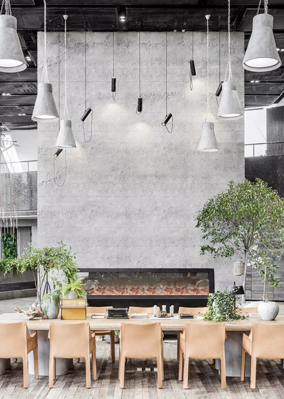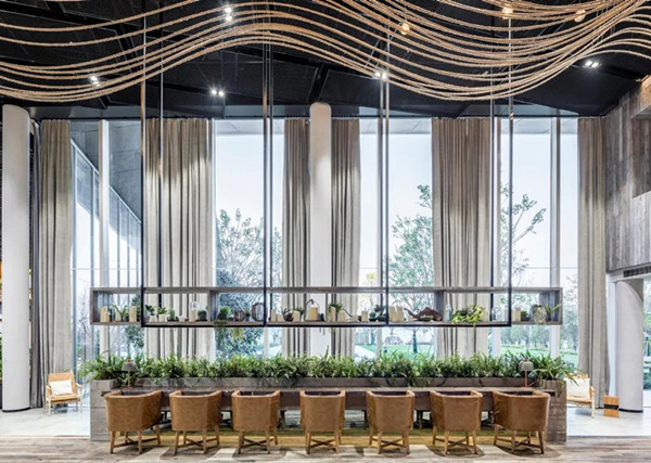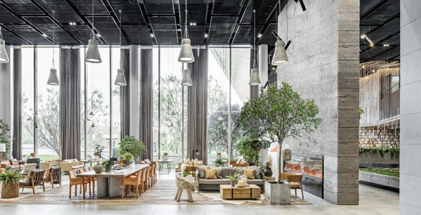 風(fēng)化打造的山石、自然形成的山脈、歲月留痕的年輪在空間中肆意演繹,大面積使用的清水混凝土、樸實(shí)的木材還原自然的樸實(shí)。生命之色——沁心的綠讓空間充滿了活力,營造出了一個(gè)與自然同行的蓊郁憩所,在空間中發(fā)酵出舒緩閑逸、靜定而又悠遠(yuǎn)的情愫。