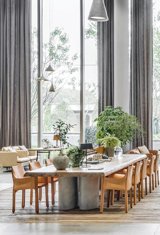 空間中,質(zhì)樸的木材上,刻著歲月的痕跡,令堅(jiān)硬的材料有著驚人的柔軟之感。一簇簇綠植錯(cuò)落于其上,在空間中輕盈地呼吸、吐納,熒熒散發(fā)著新鮮而又純粹的沁香。