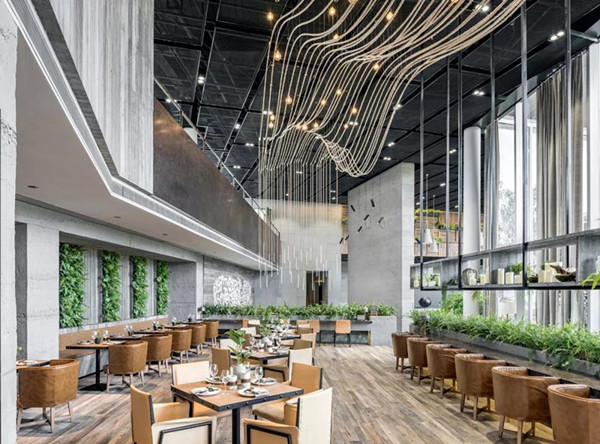 簡餐區(qū)的上空,一根根柔軟的藤蔴懸浮于半空中,如豐收的麥浪在秋風(fēng)中律動著,蕩漾著;其上方的燈具,宛若輕盈的蒲公英,在麥田里盡情飄舞。當(dāng)人們置身于此時(shí),只覺著心靈分外平靜舒暢。