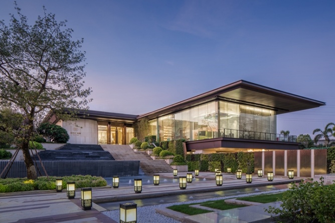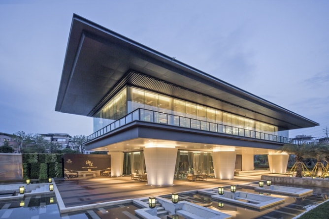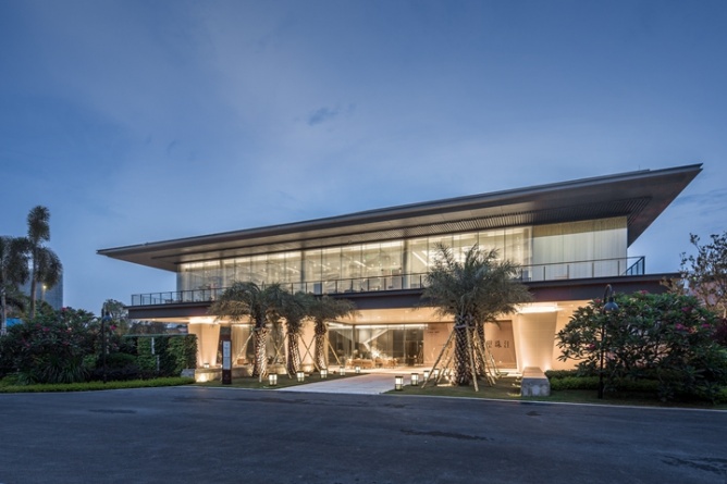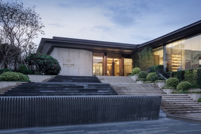 通過庭院的巨大景觀階梯,伴隨著碧波與春色,步入二層的售樓大廳,一場東方詩意與唯美的饕餮盛宴就此拉開帷幕。5米的層高,結合著九賓之禮的文化符號,沉穩含蓄的木色,精致的海棠角,在最高禮遇下,將場所的文化精神傳遞給每一位賓客。穿過雕琢精致的金屬屏風,視野瞬間悠遠開闊,置身沙盤區,仿佛身處嶺南的群山之中,朦朧間,有光透過,如夢似幻?!叭收邩飞剑钦邩匪?,中式山水畫的融入賦予空間優雅唯美的東方氣質。水吧洽談區則摒棄了傳統售樓處的功能模式,將中國的茶文化與整個銷售洽談區進行了完美的融合,將中國的傳統文化得到了很好的表達和傳承。一層則為工法展示及營銷人員辦公區,動線互不干擾,并利用架空區域,結合景觀設置了賓客休閑活動平臺,亦動亦靜,濃淡相宜。